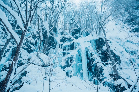 厳寒の奥入瀬渓流ならではの、岩壁を覆う氷のアート