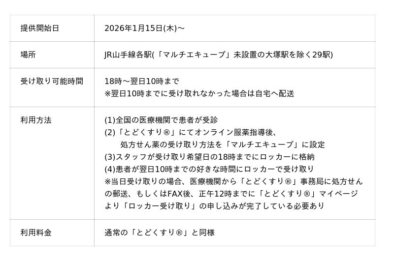 株式会社JR東日本スマートロジスティクス(本社:東京都墨田区、代表取締役社長:市原康史、以下 JR東日本スマートロジスティクス)とTOPPANホールディングスのグループ会社であるおかぴファーマシーシステム株式会社(本社:東京都千代田区、代表取締役:倉重 達一郎、以下 おかぴファーマシー)は、JR山手線各駅(「マルチエキューブ」未設置の大塚駅を除く29駅)のロッカーを活用した処方せん薬の受け取りサービスを2026年1月15日に開始します。