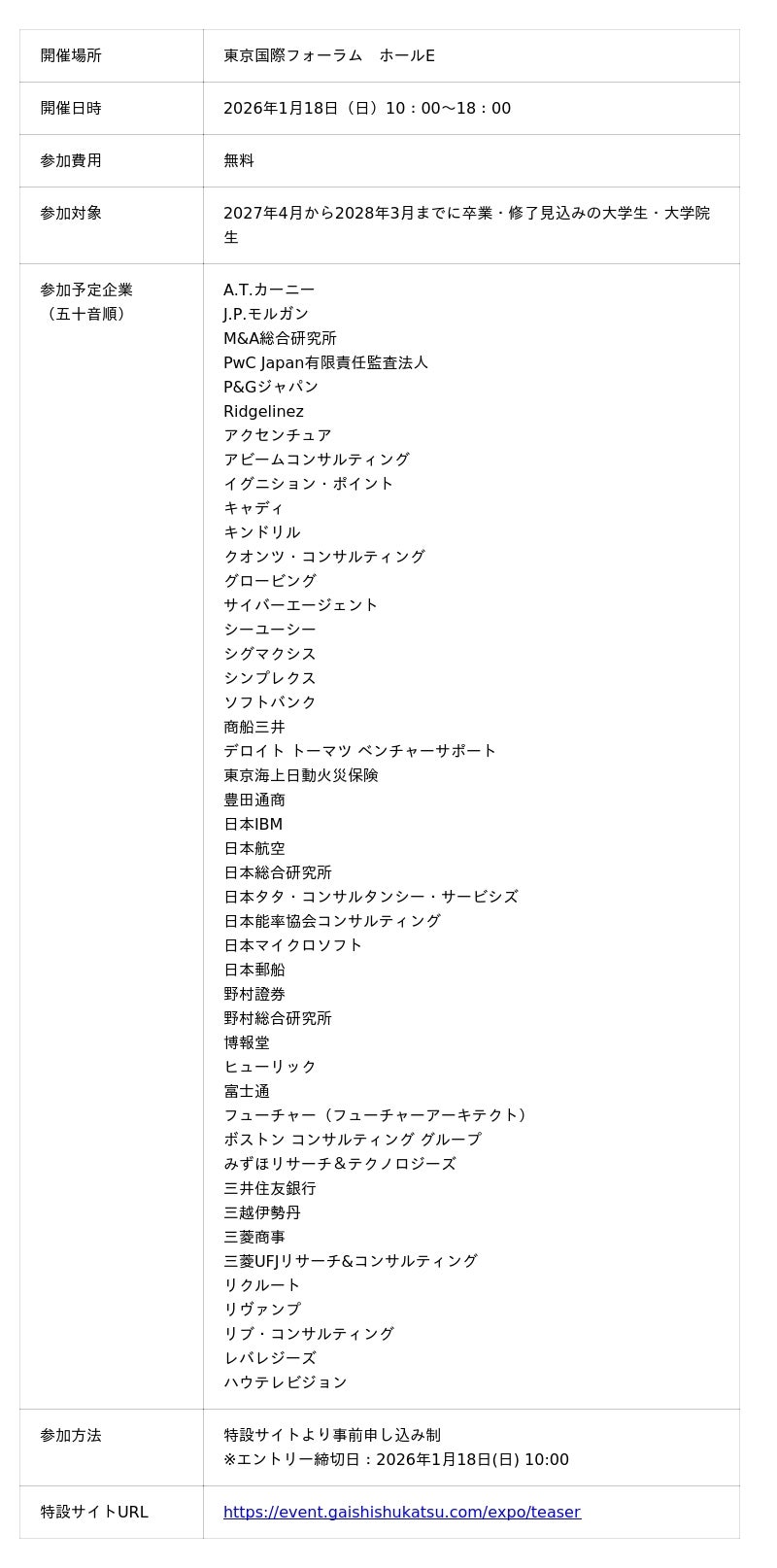 「世界で挑戦できる人材を育み、未来を創る」を掲げ、ユーザーファーストを追求したキャリアプラットフォーム「外資就活ドットコム」を運営する株式会社ハウテレビジョン(本社:東京都港区、代表取締役:音成洋介)は2026年1月18日(日)開催の28卒学生を対象とした、これからを担う次世代リーダーのための合同企業説明会「外資就活Expo」の詳細が決定したことをお知らせします。