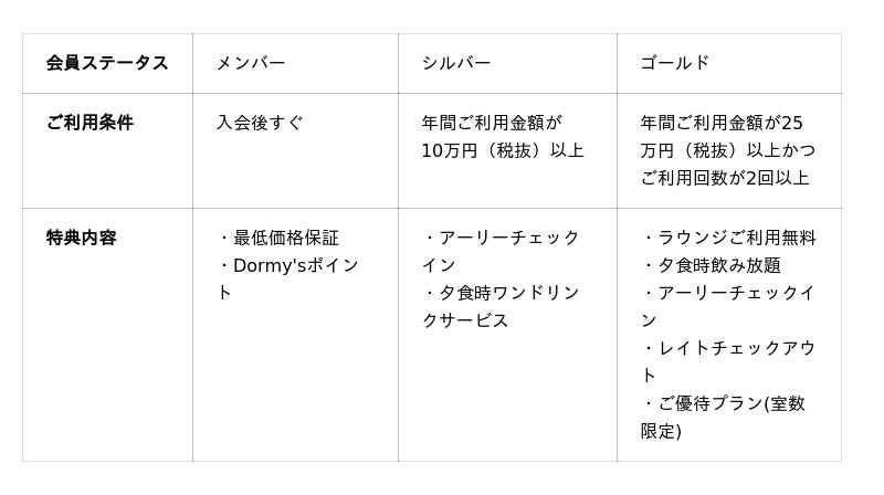 入会費・年会費は無料で、「メンバー」「シルバー」「ゴールド」の3つの会員ステータスを設け、ご利用実績に応じてステータス特典が受けられるサービスです。