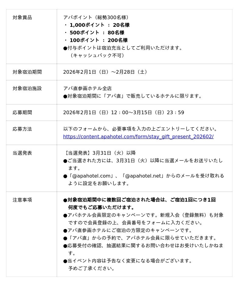 本キャンペーンは、「アパ直」(公式サイト・アパアプリ)からのご予約で、対象期間中にアパ直参画ホテルにご宿泊いただき、キャンペーン応募フォームよりごエントリーいただいたアパホテル会員の中から、抽選で総勢300名様に最大1,000ポイントをプレゼントいたします。