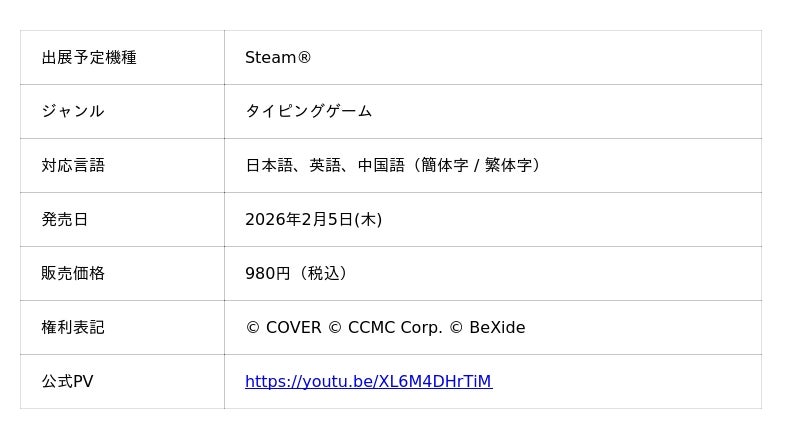 株式会社ビサイド(本社:東京都立川市、代表取締役社長:南治 一徳、以下ビサイド)は、インディーゲームプロジェクト「B-SiDE」として開発した新作タイピングゲーム『ホロタイプ お宝ゾンビの島』を、ホロライブプロダクションが提供する二次創作ゲームブランド「holo Indie」より、Steam(R)にて2026年2月5日にリリースすることをお知らせいたします。