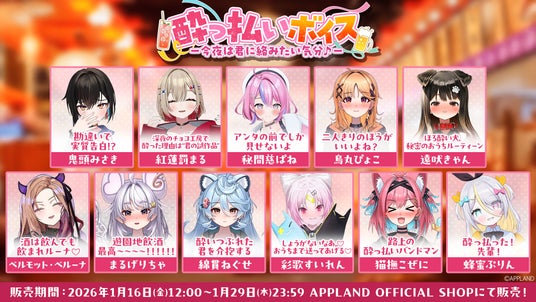 .LIVEとぶいぱいメンバーそれぞれが考案した、酔っ払いに関するシチュエーションが楽しめるボイスコンテンツをAPPLAND OFFICIAL SHOP(https://4693.live/)にて2026年1月16日(金)12時から販売いたします。