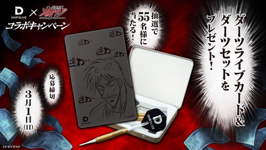 ダーツライブのオンラインマシン「ダーツライブ3」「ダーツライブ2」にて、コラボゲーム「カイジカウントアップ」を期間限定で展開いたします。ゲーム内では、アニメ『カイジ』のナレーションでお馴染みの声優・立木文彦氏の”撮り下ろしボイス”が流れるスペシャル仕様となります。プレイ条件を満たした方を対象に、デジタルコンテンツのプレゼントや抽選キャンペーンを実施いたします。