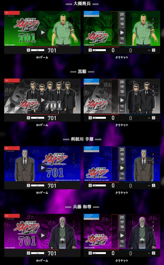 アニメ『カイジ』に登場する人気キャラクターたちがゲーム背景に設定できるデジタルコンテンツです。特定の点数にダーツが刺さると、各キャラの名シーンを見ることができます。