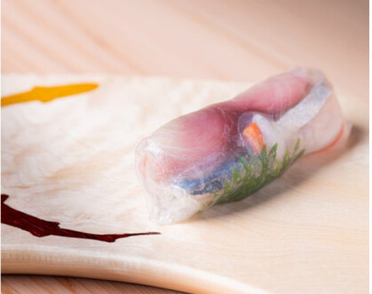 米をライスペーパーに置き換えた「〆鯖の生春巻き」など、江戸前鮨の枠を超えたユニークなメニューが話題に