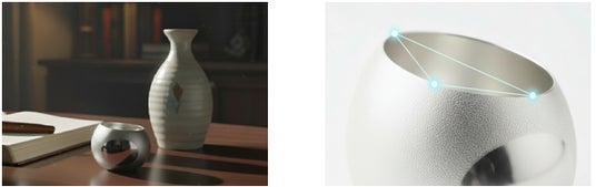 最大の特徴は、使うほどに持ち主の「手跡(てあと)」が刻まれていく「育てるぐい呑み」である点です。完璧な鏡面に磨き上げられた表面は、指が自然と触れる部分から光沢が変化し、持ち主だけの穏やかな「影」として定着。ぐい呑みが世界に一つだけの芸術作品へと育ちます。また、非対称な「三辺杯」を採用し、三つの異なる飲み口が香りや味わいの変化をもたらします。純銀の高い熱伝導率は冷酒の温度を指先に伝え、抗菌性にも優れ、雑味のないピュアな風味を引き立てます。