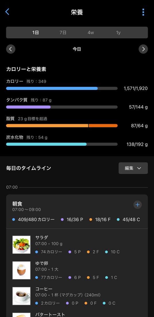 - 身長、体重、性別、活動量、平均消費カロリーに基づいて、パーソナライズされたカロリーや栄養素の目標値を表示。たんぱく質摂取量を増やすなど、目的に応じたカスタマイズにも対応