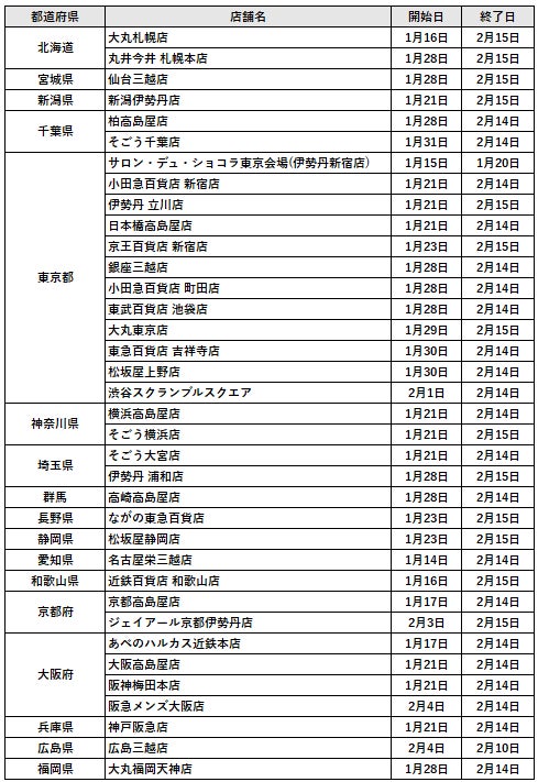 チョコレート売り場等出店一覧