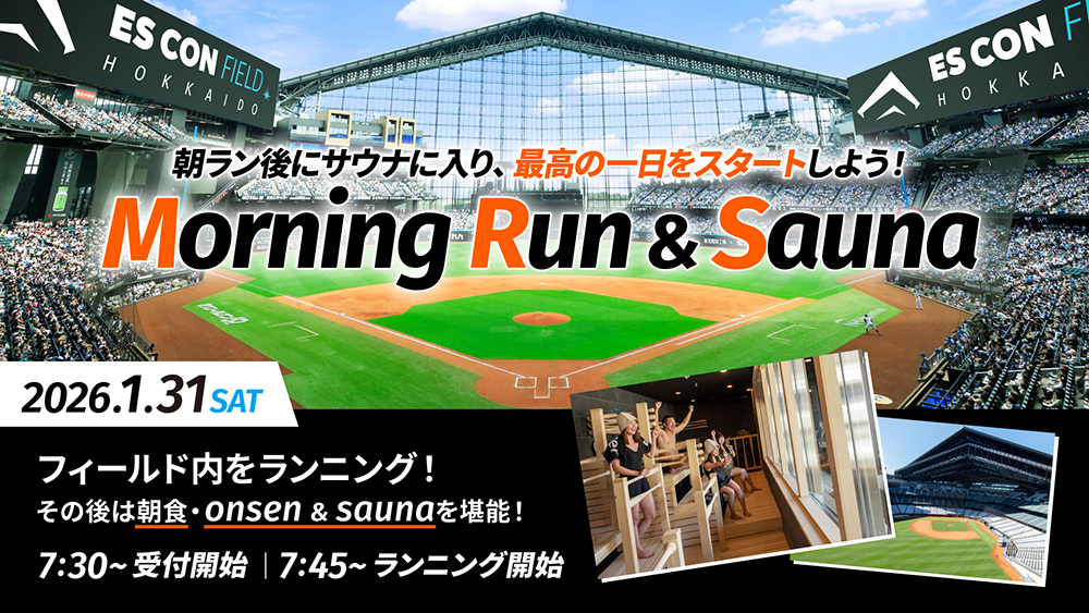 1月31日(土)に「Morning Run & Sauna」を開催いたします!エスコンフィールドHOKKAIDOのグラウンドレベルをランニングコースとし、冬の気候に左右されず、快適なランニング環境が整う、唯一無二のコースとなっています。ランニング後は”HOTDOG FUN”のシャウエッセンホットドッグで朝食を楽しみ、そして最後は世界初フィールドを一望できる球場内天然温泉「tower eleven onsen & sauna」で、最高の“ととのい”体験をしましょう!