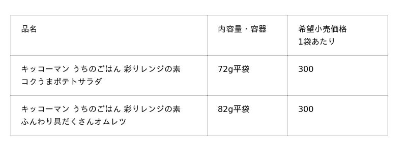 キッコーマン食品株式会社は、2月2日に、満足感のある副菜を簡単につくることができる「キッコーマン うちのごはん 彩りレンジの素」シリーズを、全国で新発売します。「コクうまポテトサラダ」と「ふんわり具だくさんオムレツ」の2アイテムです。