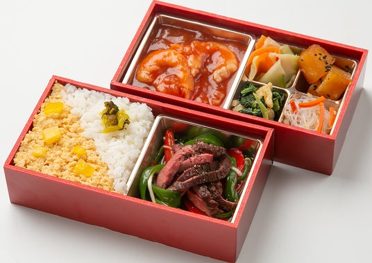 ステーキ用のお肉を使用した肉感のあるビジュアルが特徴のサワダ式青椒肉と、プリッとした海老の歯ざわりとトマトの酸味がマッチした海老チリ、店舗の人気メニューを一度に楽しむことのできる贅沢なお弁当です。高級感のある二段重で、会議や接待などの大切な場面にもぴったり。失敗できないビジネスシーンで、ぜひお楽しみください。
