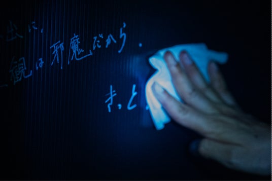 劇中の重要シーン「言霊の清掃」で参加者に配布。暗室内で壁にこびりついた"想い"を拭き清める、印象的な体験シーンで活躍します。