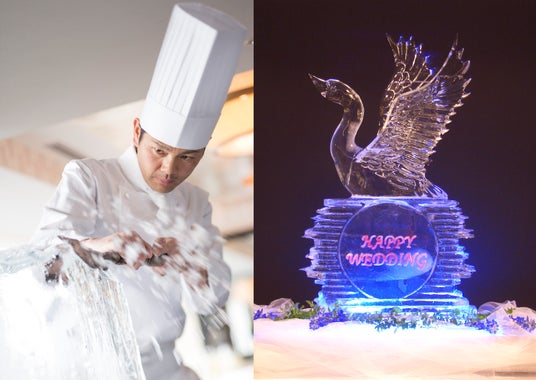 世界チャンピオンや内閣総理大臣賞の受賞歴を持つ氷彫刻家・平田浩一が手掛ける豪華氷彫刻を展示します。会場の雰囲気と調和しながらも披露宴に華やかさを添える圧巻のアート。澄み切った氷と卓越した技術で生み出す唯一無二の作品は、おふたりの特別な一日をよりきらびやかなものにします。この日しか見ることのできない氷彫刻をお見逃しなく。