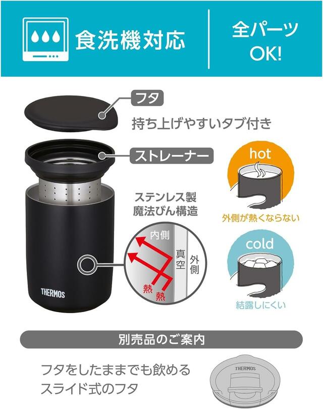 サーモスならではの真空断熱構造により、淹れたての温かさや冷たさをしっかりキープ。時間をかけてお茶を楽しみたい人にも向いています。