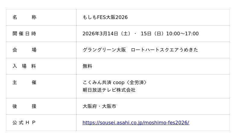 こくみん共済 coop 〈全労済〉(全国労働者共済生活協同組合連合会 代表理事 理事長:打越 秋一)は、朝日放送テレビ株式会社(代表取締役社長:今村 俊昭)とともに、「防災・減災」の普及啓発を目的としたイベント『もしもFES大阪2026』を3月にグラングリーン大阪で今年も開催いたします。