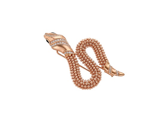 ガブリエル・レオーネは、ブルガリ・ブルガリのウオッチにセルペンティのブローチを合わせました。