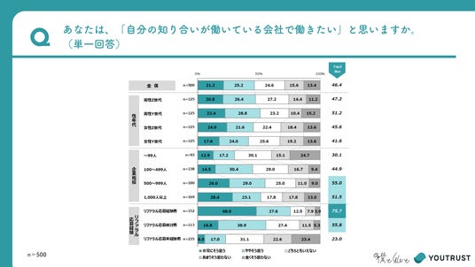 「知り合いがいる会社で働きたいか」を尋ねたところ、世代・性別を問わず「非常にそう思う」「ややそう思う」が全体の約半数を占めました。特にY世代男性は51.2%と高く、Z世代男性(47.2%)・Z世代女性(45.6%)と比べても強い傾向が見られました。