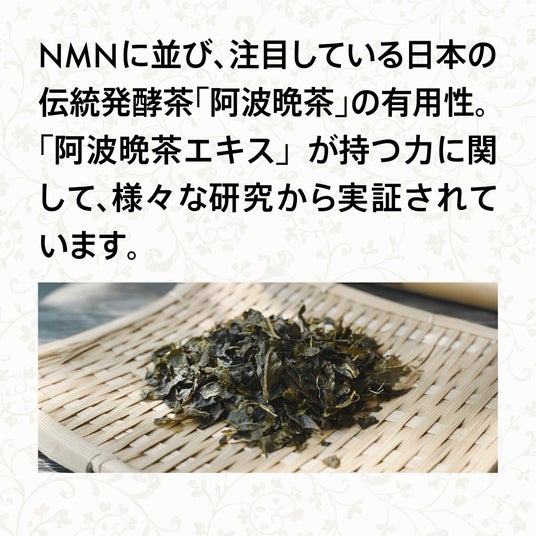 一般的な緑茶とは異なる「後発酵」という希少な製法で知られる阿波晩茶のエキス末を使用。この日本古来から根付く伝統的な発酵の知恵を、先端科学で解き明かすことで、中高年の生活習慣を整えます。・1粒で100mgの阿波晩茶エキスを配合