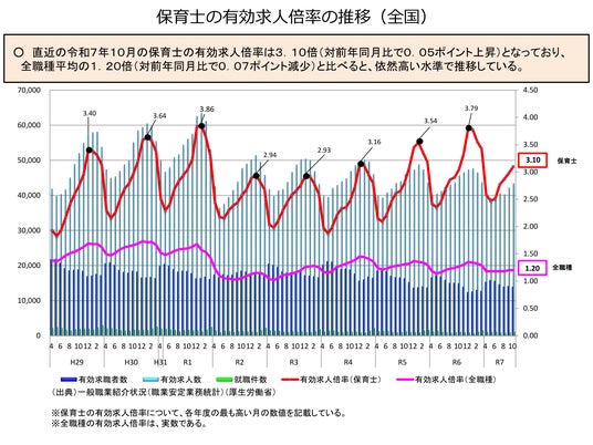 少子化が進む一方、共働き世帯の増加などを背景に保育ニーズは依然として高く、全国的に保育士不足が続いています。こども家庭庁によると、令和7年10月の保育士の有効求人倍率は全国平均で【3.10倍】と全職種平均(1.20倍)を大きく上回る水準で推移しており、人材確保が困難な状況が続いています。