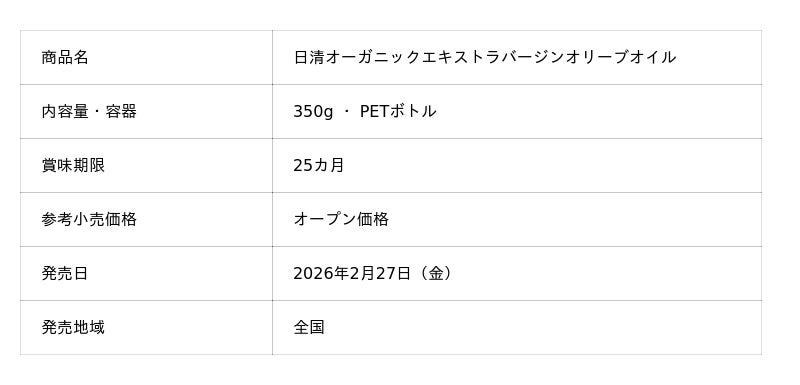 日清オイリオグループ株式会社(社長:久野 貴久)は、有機栽培のオリーブ果実のみを搾ったエキストラバージンオリーブオイル「日清オーガニックエキストラバージンオリーブオイル350g」を発売します。