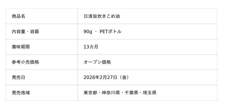 日清オイリオグループ株式会社(社長:久野 貴久)は、炊飯前にお釜に入れるだけで、ふっくらとつぶ立ちが良いおいしいごはんが炊ける「日清旨炊きこめ油90g」を発売します。