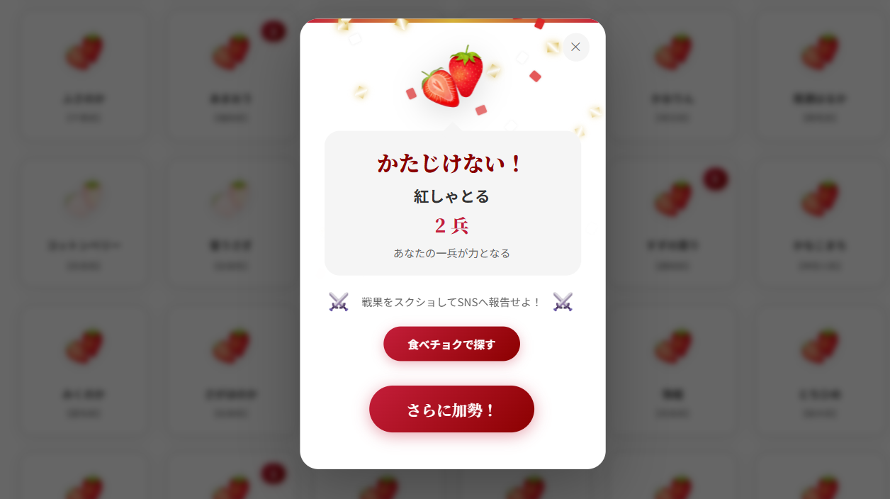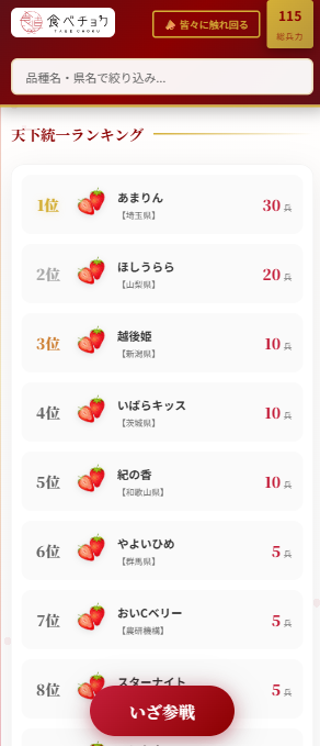 投票サイトでは、参戦する110品種のいちごに対して「加勢(投票)」が可能です。
