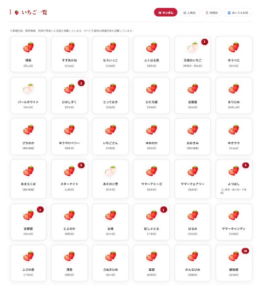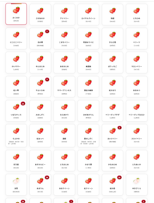 栃木県の「とちあいか」、千葉県・三重県・香川県共同開発の「よつぼし」、茨城県の「いばらキッス」などの有名品種から、埼玉県の「あまりん」「かおりん」「べにたま」などの話題の品種、福島県の「ゆうやけベリー」、千葉県の「チーバベリー」、三重県の「うた乃」、和歌山県の「紀の香」などの希少品種まで、いちご生産量が国内トップクラスの栃木県をはじめ、全国38都道府県から、110品種の多様ないちごがエントリーしています。