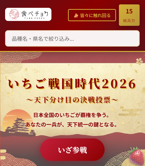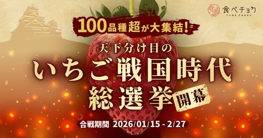 認知度・利用率など9つのNo.1(※1)を持つ日本最大の産直通販サイト(※2)「食べチョク」を運営する株式会社ビビッドガーデン(本社:東京都港区、代表取締役社長:秋元里奈)は、100品種以上のいちごの中から頂点を決める、エンターテインメント型投票イベント「天下分け目のいちご戦国時代2026」の特設サイトを公開しました。