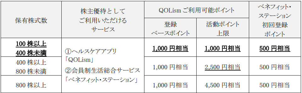 また、現行の400株以上800株未満の基準においても、「QOLism」ポイントの最大獲得上限枠を1,000円相当拡大いたします。