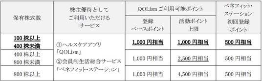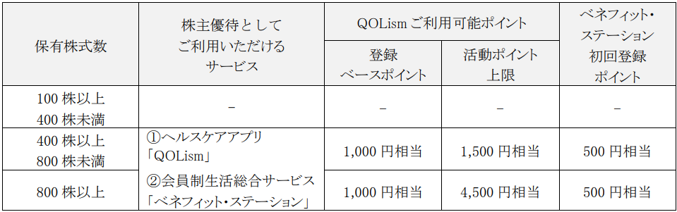 これにより、100株以上当社株式を保有される国内居住の株主の皆さまが、当社株主優待の「QOLism」及び「ベネフィット・ステーション」をご利用いただけます。
