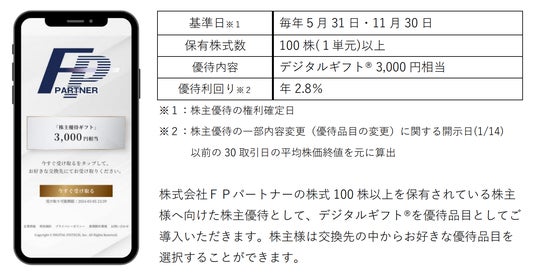 株式会社FPパートナー(代表取締役社長:黒木 勉、東証プライム:証券コード 7388)において、株式会社デジタルプラス(代表取締役社長:菊池 誠晃、本社:東京都渋谷区、東証グロース市場:証券コード3691)グループが運営する「デジタルギフト(R)」を株主優待としてご活用いただくことになりました。