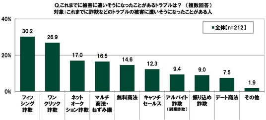 これまでに、詐欺などのトラブルの被害に遭いそうになったことがある人(212名)に、被害に遭いそうになったことがあるトラブルを聞いたところ、「フィッシング詐欺」(30.2%)が最も高くなり、「ワンクリック詐欺」(26.9%)、「ネットオークション詐欺」(17.0%)、「マルチ商法・ねずみ講」(16.5%)、「無料商法」(14.6%)が続きました。