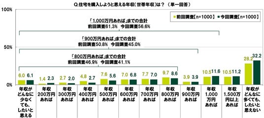 - 20代の半数以上が住宅を購入しようと思えるのは「年収1,000万円」、前回調査からハードルが上昇
