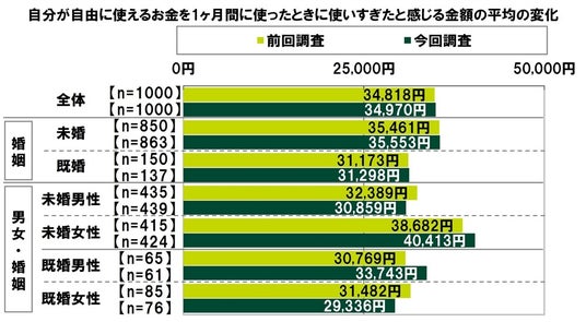 前回の調査結果と比較すると、使いすぎたと感じる金額の平均は152円の増加(前回調査34,818円→今回調査34,970円)となりました。