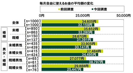 前回の調査結果(※1)と比較すると、毎月自由に使えるお金の平均は2,446円の減少(前回調査34,605円→今回調査32,159円)となりました。