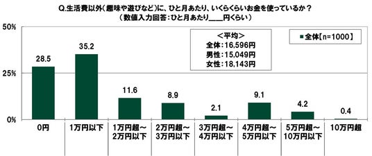 全回答者(1,000名)に、生活費以外(趣味や遊びなど)に、ひと月あたり、いくらくらいお金を使っているか聞いたところ、「1万円以下」(35.2%)に最も多くの回答が集まったほか、「1万円超~2万円以下」(11.6%)や「2万円超~3万円以下」(8.9%)、「4万円超~5万円以下」(9.1%)にも回答がみられ、平均は16,596円でした。また、「0円」は28.5%となりました。