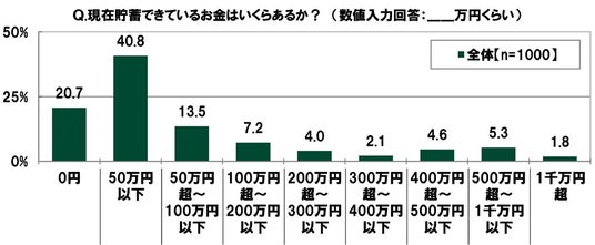 現時点で、どのくらいの貯蓄ができているか聞いたところ、「50万円以下」(40.8%)に最も多くの回答が集まったほか、「50万円超~100万円以下」(13.5%)にも回答がみられ、調整平均(※2)は74万円でした。また、「0円」は20.7%となりました。