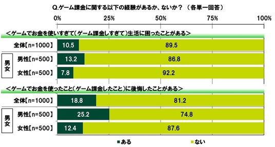 また、ゲーム課金での経験を聞いたところ、<ゲームでお金を使いすぎて(ゲーム課金しすぎて)生活に困ったことがある>では「ある」は10.5%、<ゲームでお金を使ったこと(ゲーム課金したこと)に後悔したことがある>では「ある」は18.8%となりました。
