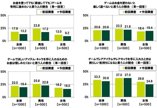 まず、お金を使ってゲームをすることについて聞いたところ、<お金を使ってでも(課金してでも)ゲームを有利に進めたい>では「そう思う」は13.2%、<お金を使わないと楽しく遊べない>では「そう思う」は20.6%となりました。