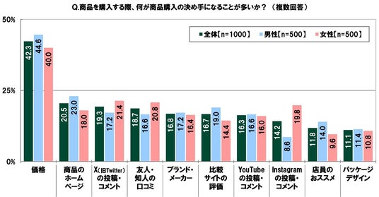- 商品購入の決め手になるポイント 1位「価格」男性では2位「商品のホームページ」3位「比較サイトの評価」、女性では2位「X(旧Twitter)の投稿・コメント」3位「友人・知人の口コミ」