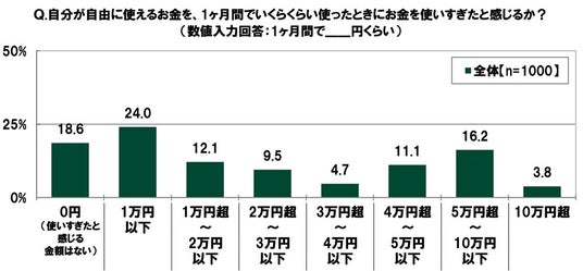 全回答者(1,000名)に、自分が自由に使えるお金(お小遣い)を、1ヶ月間でいくらくらい使ったときにお金を使いすぎたと感じるか聞いたところ、「0円(使いすぎたと感じる金額はない)」(18.6%)や「1万円以下」(24.0%)、「5万円超~10万円以下」(16.2%)などに回答が分かれ、平均は34,970円でした。
