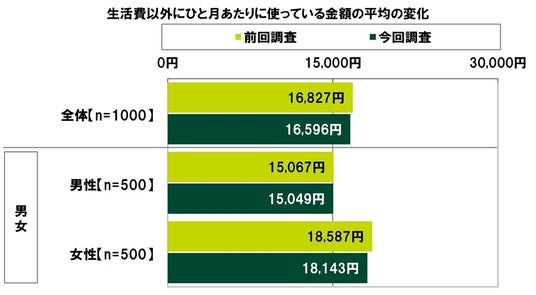 前回の調査結果と比較すると、生活費以外に使っている金額の平均は、全体では231円の減少(前回調査16,827円→今回調査16,596円)、男性では18円の減少(前回調査15,067円→今回調査15,049円)、女性では444円の減少(前回調査18,587円→今回調査18,143円)となりました。