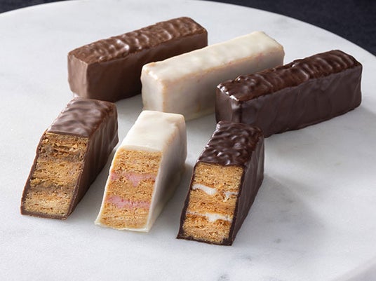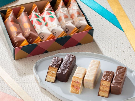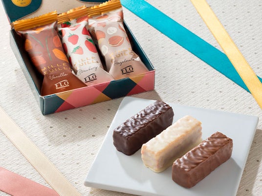 バター100%使用のサクサクと軽いパイ生地と、すっきりとした甘さで口溶けの良いチョコレートが層を成す、香り豊かなミルフィーユです。バニラとヘーゼルナッツ、苺の3種類を華やかなデザインのパッケージに詰め合わせた冬季限定商品です。