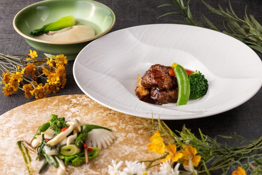 上條料理長が手掛けるのは、天外天が自信をもっておすすめする「天外天オリジナル四川ダック」。紅茶で燻したスモーキーな香りと、皮付きのまま仕上げた肉のもちもちとした弾力、さらに梅肉ソースの酸味と四川の香りが重なり合う一皿です。対して島田料理長は、広東料理の真髄である「金華火腿(金華ハム)で仕上げたフカヒレの姿煮」や、中国の伝統的な黒味噌「豆鼓(トウチ)」でコク深く仕上げた「国産牛フィレ肉の中国黒味噌炒め」など、高級食材の魅力を最大限に引き出す洗練された技を披露します。