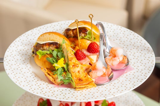 下段/いちごと生ハムのピンチョス、照り焼きチーズバーガー、スモークベーコンのアルザス風キッシュ、海老のカクテル いちごのビネグレットソース