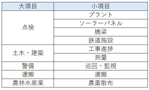 ●サービス名称:点検・工事進捗・測量・警備・運搬サービス・農薬散布