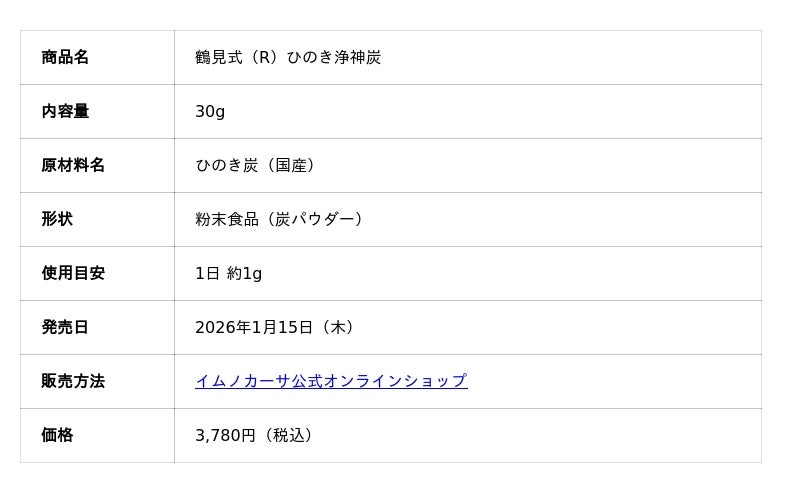 株式会社イムノカーサ(本社:東京都中央区)は、国産ひのき由来の炭パウダー食品「鶴見式ひのき浄神炭」 を、2026年1月15日より発売いたします。