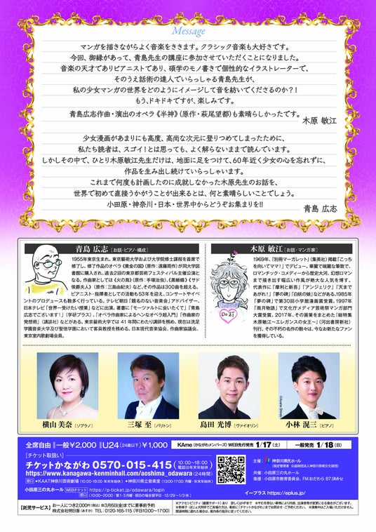 クラシック音楽とトークで贈る、少女マンガ界のレジェンド・木原敏江の華麗なる世界!古都・小田原でエレガンス溢れるひとときを。