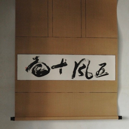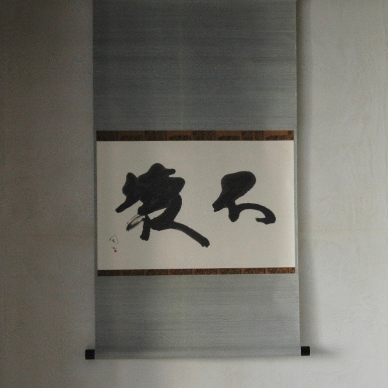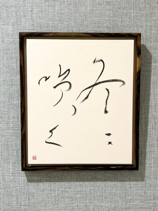 私は仕事で扱う包丁に刻まれた文字の美しさに感銘を受け、書の世界に足を踏み入れました。書は自分を整えるセルフメディテーションであり、日々の商いの合間に心に留まった言葉を墨に託しています。気温や湿度、心身の揺らぎで変わる線の勢い。そのコントロールできない揺らぎこそ、私が生きている証です。「変化の激しい現代で、壊れないものとは何か」自問自答の中で書き溜めた作品たちが、皆様の心に、ふっと静かな風を届けることができれば幸いです。